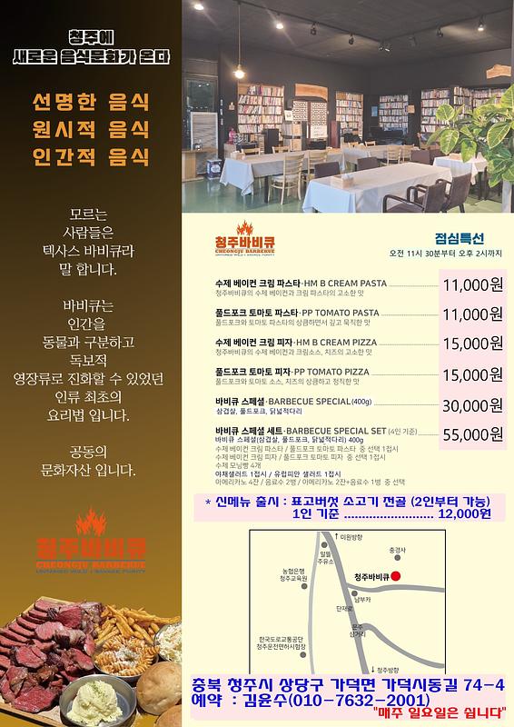 상품:바비큐, 샐러드, 피자, 파스타, 모닝빵, 커피 포함. 주소:청주시 상당구 가덕면 가덕시동길 74-4